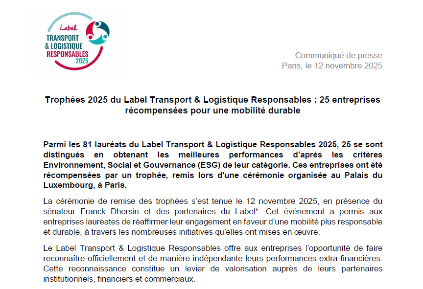 Le label « Transport & Logistique Responsables » est obtenu en fonction